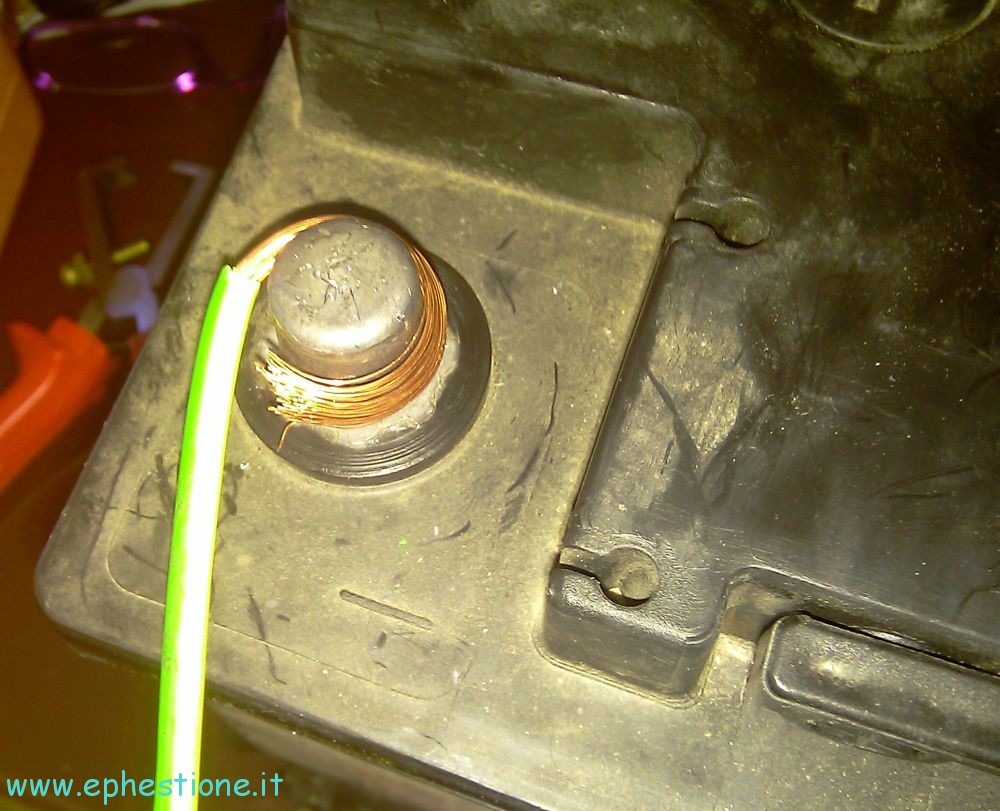 NOTA BENE: ATTENZIONE nell’effettuare il passaggio successivo: mai, Mai, MAI fare in modo tale che i poli della batteria entrino direttamente in contatto tra loro, altrimenti vi attendono BRUTTE SORPRESE, inclusi, ma non solo: shock elettrici, incendi, strumenti saldati tra loro o ai poli della batteria o ad eventuali anelli (MAI indossare anelli o simili cose metalliche durante questi lavori). Altro suggerimento: mentre connettete i cavi alla batteria, assicuratevi che l’estremità opposta o non sia stata scoperta, o se l’avete già spellata, metteteci prima sopra del nastro isolante per non fargli fare contatto altrove; questo è particolarmente vero una volta connessi entrambi i cavi, siccome potrebbero andare in corto tra loro. Quando vi apprestate a collegare la batteria al carico, scoprite una estremità alla volta (prima la positiva, poi la negativa) e mai entrambe.
